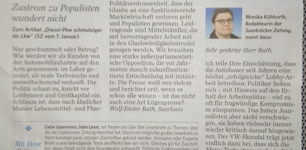 Was ist dran an der Behauptung der Rechten wir hätten eine „Lügenpresse“? Bereits am 10.12.2016 hatte ich diese Frage anhand von zwei Beispielen aus der Saarbrücker Zeitung untersucht. Heute beziehe ich mich auf einen Leserbrief vom 12.1.2017 sowie die gleichzeitige Antwort einer Journalistin darauf. Ich schrieb dazu einen Leserbrief, den ich unten anführe. Ich komme darin zu dem Schluss, dass die Saarbrücker Zeitung zwar nicht lügt aber doppelzüngig und in ihrem eigenen kommerziellen Interesse handelt.